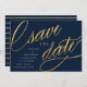 Estas tarjetas de guardar la fecha únicas y modernas presentan una tipografía elegante con efecto de lámina dorada en un fondo azul marino oscuro, con los detalles del anuncio de la boda en blanco. La parte posterior presenta un patrón de rayas azul marino y dorado de moda. ¡Cambia el color de fondo usando la herramienta "Personalizar"!