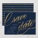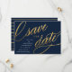 Estas tarjetas de guardar la fecha únicas y modernas presentan escritura elegante en un efecto de lámina dorada falsa sobre un fondo azul marino oscuro, con los detalles del anuncio de la boda en blanco. La parte posterior presenta un patrón de rayas de moda en azul marino y dorado. ¡Cambia el color del fondo utilizando la herramienta "Personalizar"!