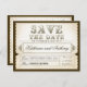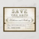 tarjetas postales de guardar la fecha con hermosa tipografía vintage con fondo de papel rústico antiguo y adorno de volutas antiguas alrededor del nombre de la novia y el novio.