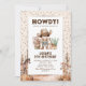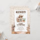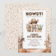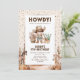 Invitaciones de cumpleaños infantiles rústicas del oeste con confeti de fiesta, escenario de postre con caballos, un vaquero lindo con cabello oscuro y una plantilla de celebración moderna fácil de personalizar.