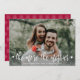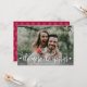 Tarjetas de Invitación de embarazo para Navidades fotográficos. ¡Esperando padres! La escritura moderna de tipografía con letras blancas "cuanto más alegre" es la tarjeta de texto para compartir tus felices noticias con familiares y amigos en la temporada navideña. En el fondo de los copos de nieve en color rojo. Puede personalizar el diseño reemplazando el texto de muestra y la foto horizontal. #3344