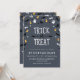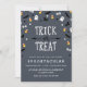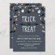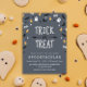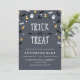 Divertidas invitaciones de Halloween con confeti de fantasmas, ojos, maíz dulce, murciélagos y zapatos y escobas de brujas. La tipografía escrita a mano 'Truco o Trato' está rodeada de confeti; debajo está el texto personalizado de la invitación a la fiesta. Fondo texturizado claro - incluso puedes cambiar el color del fondo usando la herramienta de personalización. ¡Perfectas también como invitaciones de cumpleaños de Halloween!
