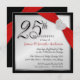 Tarjetas de invitación elegantes para la fiesta de aniversario de plata número 25 con cinta roja simulada y corazón de estrás plateado -- Personalice el nombre, la fecha y los detalles para esta feliz ocasión. **NOTA: Tamaño para tarjetas de invitación CUADRADAS. Disponible franqueo a juego, sobres y tarjetas de agradecimiento. Tarjetas de respuesta a juego abajo: