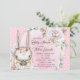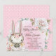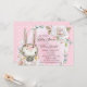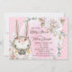 Tarjetas de invitación para baby shower de conejito adorable con caprichosas flores en el cabello sobre un fondo de lunares rosados dulces. Estas invitaciones de baby shower de conejito son fácilmente personalizables para su evento simplemente agregando sus detalles.