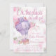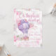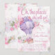 Invitaciones para baby shower de globo aerostático con hermoso globo aerostático de color lavanda y flores sobre una nube y fondo floral vintage. Esta hermosa invitación para baby shower de globo aerostático se personaliza fácilmente para su evento simplemente agregando sus datos.