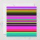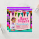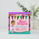 Invitación para baby shower con una linda bebé vistiendo un vestido colorido de Puebla sobre un fondo festivo de serape multicolor. Estas adorables invitaciones para baby shower de niña se personalizan fácilmente para su evento simplemente agregando sus datos.