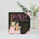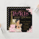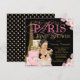 Invitaciones de baby shower de París con una hermosa Torre Eiffel dorada, elegantes paquetes de regalo de París, dulce bebé niña con un lindo traje rosa y negro y boina y collar de perlas con elegante letra rosa de París sobre un rico fondo floral rosa. Esta hermosa invitación para baby shower de París se personaliza fácilmente para su evento simplemente agregando sus datos en el estilo de letra y color, y redacción de su elección.