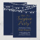 ¡Celebre un día especial con esta invitación de fiesta sorpresa dorada! Este diseño presenta una tipografía de guión elegante con una textura de brillo dorado y luces de cuerda en un fondo azul marino. Puede personalizar el color de fondo.