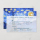 La tarjeta de respuesta a la invitación de boda presenta una pintura artística en tributo a "Noche Estrellada" de Van Gogh. Tiene un color más brillante e incorpora brillo en su imagen final para una noche brillante. Personalice estas tarjetas de respuesta a la invitación de boda con todos sus detalles personales para una invitación con tema de boda artística.