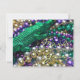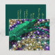 Fotografía de collares coloridos de Carnaval. Los colores de Mardi Gras (dorado, verde, morado) están presentes en un gran collar de caimán verde que enmarca la foto. La parte frontal de la tarjeta de invitación dice "Mardi Gras". La parte trasera de la tarjeta de invitación tiene "Laissez les bon temps rouler!" como saludo y espacio para agregar los detalles personalizados de la invitación a su fiesta de Carnaval personalizada. Todas las palabras en la tarjeta se pueden personalizar, según sea necesario.