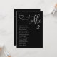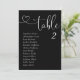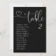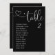 Las modernas tarjetas de mesa de Boda negro son el toque final perfecto para su recepción nupcial. Guíe a sus huéspedes para que se sientan con esta tabla de asientos única. Las tarjetas son perfectas para colgar o mostrar en una mesa o pared. El diseño presenta un tipo mínimo de letra para el corazón en blanco sobre un fondo negro. El diseño está impreso en ambos lados.