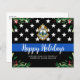 Envía saludos navideños felices a amigos, empresarios, compañeros de los departamentos de aplicación de la ley y a tu comunidad con esta tarjeta única de Navidades del Departamento de Policía de la Línea Azul - Bandera estadounidense con los colores de la bandera de la policía, negro y azul moderno con hojas y bayas huecas. Personaliza con el logo, mensaje y departamento del departamento de policía . Estas postales de navidad barata necesitan ser enviadas por correo como postales sobredimensionadas, por lo que pueden incurrir en cargos de franqueo estándar, pero no necesitan un sobre o una etiqueta de dirección de retorno. DERECHOS RESERVADOS © 2020 Judy Burrows, Black Dog Art - Todos los derechos reservados. Navidades del Departamento de Policía Presupuestaria Postales de vacaciones delgadas de la línea azul