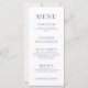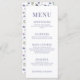 Descubra su experiencia boda con estas sofisticadas tarjetas de menú boda rústico color agua, con flores moradas y un elegante texto morado.