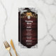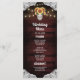 Tarjetas de menú de boda con girasoles y frasco de albañil en madera de granero: presentan un fondo de madera de granero rojo intenso recortado con encaje y decorado con luces centelleantes de cuerda de color cálido. El diseño también presenta un ramo de girasoles dentro de un frasco de albañil que puedes personalizar con las iniciales de tu elección. La parte posterior también presenta el mismo fondo rústico de campo para que coincida con la parte delantera.