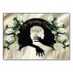 Tarjetas personalizadas de número y nombre para cada invitado en la mesa con diseño de abrazo en silueta con negro sobre seda dorada que hacen una poderosa declaración