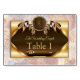 Un diseño de atrapasueños con adornos dorados y marrones que incluye un círculo de bambú redondo con una red de vida con plumas de tonos marrones y cuentas rojas sobre un fondo de plumas suaves para personalizar tu propio tema de papelería para tarjetas de número y nombre para cada invitado en la mesa.