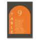 Eleva la disposición de asientos de tu evento con este número de mesa moderno y minimalista. El diseño presenta un arco naranja atrevido sobre un fondo gris carbón, con el número grande '9' que se muestra de manera prominente. Debajo del número, una lista de nombres de invitados se presenta elegantemente en una fuente limpia, lo que facilita a los asistentes encontrar su mesa asignada. Este número de mesa añade un toque sofisticado y contemporáneo a bodas, eventos corporativos o cualquier ocasión especial que busque una estética chic. Su diseño único garantiza que será una adición elegante y funcional a la configuración de tus mesas.