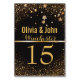 Tarjetas de número de mesa boda Starry black y gold para su decoración de bodas personalizada. El carbón vegetal mate el fondo negro con un falso purpurina de Relieve metalizado dorado en los bordes superior e inferior con estrellas de plata y oro diseminadas por la parte superior. Una tira metálica dorada separa los nombres personalizados de novias y novios de color dorado y el apellido en escritura elegante de un gran número de tabla de tonos dorados. Idéntico en el otro lado. Personalizar individualmente y agregue cada tarjeta número de tabla boda por separado a su carrito de compras Zazzle. Perfecto para elegantes bodas purpurinas negros y dorados, así como para los temas bodas inspirados en el Art Deco de los Grandes Gatsby. Adecuado para otras ocasiones especiales, como fiestas de compromiso, duchas de novias o bodas, etc.