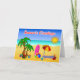Diseños soleados de Marte del ©. El navidad en Australia vara la escena - tarjeta de felicitación del navidad con un ilustracion tropical de la playa con una palmera con las decoraciones del navidad, los presentes, un tablero de resaca, parasol de playa, toalla, bola, cubo y espada y las correas.