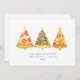 Ilustración de tres porciones de pizza con forma de árbol de Navidad coronadas con una estrella. Personaliza el nombre y el año.