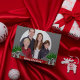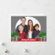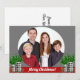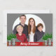 Estas tarjetas de vacaciones personalizadas modernas y rústicas le permiten agregar su propia foto familiar o de grupo que se mostrará como un recorte de foto circular, con frascos Mason cubiertos de cuadros de búfalo rústicos que sostienen pequeños árboles de Navidad iluminados y piñas, sobre un fondo gris medio. Personalice tanto el texto de "Feliz Navidad" en la parte delantera como la salutación en la parte trasera.