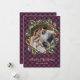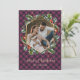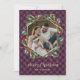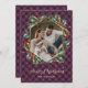 Elegantes tarjetas de Navidades de fotos de color personalizado morado y dorado con título de caligrafía y con un marco de foto geométrico adornado con una corona botánica. Personaliza fácilmente estas tarjetas de Navidades de fotos con trenzas de búfalo morado con tu imagen y un nombre de familia.