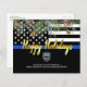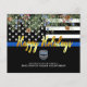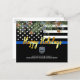 Envía saludos navideños de Feliz a amigos, empresarios, compañeros de los departamentos de aplicación de la ley y a tu comunidad con esta tarjeta única de Navidades del Departamento de Policía de la Línea Azul - Bandera estadounidense con los colores de la bandera de la policía, negro y azul moderno con hojas y bayas huecas y un elegante guión de oro. Personaliza con el logo, mensaje y departamento del departamento de policía . Estas postales de navidad barata necesitan ser enviadas por correo como postales sobredimensionadas, por lo que pueden incurrir en cargos de franqueo estándar, pero no necesitan un sobre o una etiqueta de dirección de retorno. DERECHOS RESERVADOS © 2020 Judy Burrows, Black Dog Art - Todos los derechos reservados. Tarjetas de Navidades de la policía delgadas de la línea azul