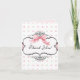 Esta nota de agradecimiento se coordina con el Baby Shower Invitation y cuenta con elegantes movimientos de copas franceses, puntos rosas y verdes en el fondo, una cinta rodada y un hermoso arco rosado pintado a mano. Todo hecho con obras de arte originales de Audrey Jeanne Roberts. El resultado es un bonito conjunto contemporáneo para bebés. Al revés hay el mismo patrón de puntos y un corchete que revela un lugar para la foto de su bebé. TAMBIÉN PODRÍAS DISFRUTAR: