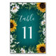 Tarjetas de número de mesa para boda campestre con girasoles teal - presentan un fondo de madera de granero teal o turquesa decorado con margaritas de acuarela, girasoles, vegetación, aliento de bebé y lirio de valle.