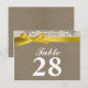 bello fondo rústico de burlap, encaje blanco y diseño de cinta amarilla impresa boda tarjetas de número de tabla. Lo mejor para fiestas de estilo rústico, jardín o vintage con tonos blancos y amarillos.