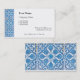 Tarjetas de visita personalizado con un patrón de fondo de mosaico falso Delft azul y blanco vintage. Haga clic en Personalizar para cambiar los colores de fondo, las fuentes, agregar texto personalizado y más, incluso para guardar el diseño más adelante.