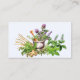 Plantilla de tarjeta de presentación de hierbas para el herbolario, naturópata o boticario. Grupos de hierbas curativas se presentan en la parte delantera y trasera. Color púrpura pálido con texto amarillo-verdoso para personalizar en tres lugares en la parte frontal. Incluya el negocio en fuente impresa en negrita en la parte superior. Agregue un nombre en letra cursiva debajo, con más texto impreso para contacto, sitio web, redes sociales y / o dirección. Todo el texto se alinea a la derecha. Las hierbas son ashwagandha, cúrcuma y jengibre en la parte frontal con más hierbas en la parte trasera.