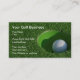 Plantilla de diseño de tarjeta de presentación con tema de golf moderno creada con una imagen de una pelota de golf en el hoyo en el césped. Creada para un instructor de entrenamiento de golf, campo de golf, club o tienda de golf. Presentada con un aspecto profesional.
