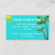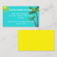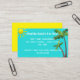 Tarjeta de presentación tropical con dos líneas de texto. Hecha como un anuncio de "condominio en alquiler", pero se puede personalizar según sea necesario para un profesional o empresa. Azul brillante con palmeras y sol. Texto blanco en la parte superior para un título o nombre, con un párrafo para información. La parte posterior es de color amarillo soleado.