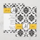 Tarjetas de invitación de boda elegantes en damasco negro y blanco con tarjeta de recepción que puede personalizar. Un hermoso fondo con patrón de damasco se acentúa con un adorno circular y monograma encima de una línea amarilla que contiene los nombres de la novia y el novio. Efectos de Photoshop con sombras dan a esta tarjeta una apariencia en 3D impresa directamente en el papel de su elección. Diseño de tarjeta de recepción de boda por Elke Clarke ©2010, 2012. Gráficos licenciados. Una forma elegante de establecer el tema de su boda. Personalice con los detalles de su boda y la información de la recepción de boda y agregue a su paquete de boda.