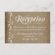 Esta tarjeta de recepción de boda tiene un aspecto vintage antiguo de arpillera con enredaderas blancas y flores hacia arriba en el lado izquierdo. Ideal para bodas campestres, bodas en un granero y bodas de vaquero. Elija entre esquinas cuadradas o redondeadas. Simplemente agregue los detalles de su recepción en el reverso de la tarjeta.