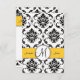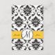 Elegantes tarjetas de recepcion para la invitación a la boda en blanco y negro para damasquinar que puedes personalizar. Un hermoso fondo de patrón de damasco se acentúa con un embellecimiento circular y un monograma encima de una línea amarilla que contiene los nombres de la novia y del novio. Los efectos de Photoshop con sombras le dan a esta tarjeta un aspecto en 3D impreso directamente en su elección de papel. Diseño de la tarjeta de recepción de boda por Elke Clarke ©2010, 2012. Gráficos con licencia. Una forma elegante de definir el tema de su boda. Personalice con los detalles de su boda y la información de la recepción de la boda y añada al paquete de su boda.