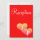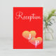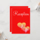 Diseño de amor de boda único y atractivo. Tarjetas de recepción de boda románticas con dos corazones en la parte delantera en tonos de una puesta de sol en amarillo dorado, rosa sobre un fondo rojo con texto blanco. Personalice la parte posterior de las tarjetas de recepción con los detalles de su boda (escriba en lugar de mi texto de muestra). Inserte la inicial monogramada del apellido de la pareja casada en texto plateado. Diseño de Arte Original por TamiraZDesigns