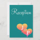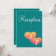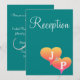 Tarjetas de recepción de boda románticas con doble corazón en la parte frontal en tonos de atardecer de amarillo dorado, naranja y rosa sobre un fondo verde turquesa con texto blanco. Personalice la parte trasera de las tarjetas de recepción con los detalles de su boda (escriba en lugar de mi texto de ejemplo). Inserte la inicial del apellido del matrimonio monogramado en texto plateado. Diseño de Arte Original por TamiraZDesigns.