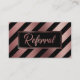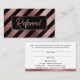 Este rico y vívido diseño presenta un llamativo Relieve metalizado de oro falso rosa y negrita negra con rayas diagonales en el frente. El centro está enmascarado por un rectángulo negro con dos bordes dorados rosas, lo que realza el diseño sofisticado. En el centro de la insignia, usando un tipo de letra de escritura moderno y bonito, hay una superposición tipográfica que dice "Remisión". Esta capa de texto gráfico fue embellecida con el mismo efecto oro rosa que usé en las franjas y bordes. En la parte posterior he configurado todos los campos de plantilla que necesitará para ofrecer los detalles y términos a sus clientes. Utilice los campos de plantilla para agregar sus propios detalles y realice los cambios de redacción necesarios. También puede hacer clic en el personalizar si desea cambiar las fuentes, tamaños o posiciones de cualquier elemento. // Ideal para propietarios de salones de belleza, estilistas de cabello, esteticistas, manicuristas y técnicos de uñas, maquilladores, masajistas, entrenadores personales, y muchos otros en industrias de sanación y servicios personales que aprecian honrar referencias de negocios. // Por favor, no dude en ponerse en contacto si tiene solicitudes especiales o necesita ayuda para personalizar. // Diseñado por Melody Watson para la Muserie de Papel.