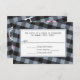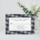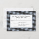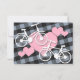 Tarjetas de respuesta RSVP de boda personalizada con un diseño alternativo que incluye 2 bicicletas blancas de él y las suyas sobre corazones rosados, y colocadas sobre un patrón de gingham gris azul y negro inclinado.