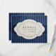 Esta tarjeta de respuesta a la invitación a la boda presenta un fondo azul oscuro a rayas en el que una cinta azul marino lleva un emblema blanco con bordes de vieira. Esta forma curvada, simétrica, que parece un corte de papel, enmarca las palabras "Por favor, responda [por - fecha de personalizable]" con un guión rápido que florece en el frente. En la parte de atrás hay una línea para que el huésped escriba su nombre y compruebe si acepta o rechaza, así como el número de clientes que acuden. El diseño tiene un toque antiguo, vintage y angustioso que se completa con la elegancia sencilla y anticuada. Explore la suite de diseño Vintage Charm... Crema azul Sage Green Lilac Purple Strawberry Rosa Golden Yellow Chocolate & Strawberry Pink Chocolate Blue Ivory & Eggplant Brillante Marina Roja y Azul Azul Azul Dusky Purple ¿No encuentras tu color exacto? Sólo envíame un correo electrónico: colleen@foreverlogos.com - ¡Lo haré, sólo por ti!