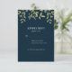 Elegantes tarjetas de respuesta para coordinar con nuestra colección de boda de hojas doradas sobre fondo navy con una línea adicional para cualquier requisito dietético. Artículos coincidentes disponibles en esta colección.