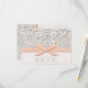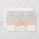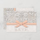 Las tarjetas de respuesta boda de encaje vintage y perlas, con un diseño de cinta adhesiva de contraste de melocotón impreso y un sutil coco cremoso con fondo blanco de damasco de marfil. Diseñado y creado por Chrissy H. Studios, LLC. Todos Los Derechos Reservados.