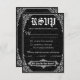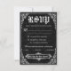 Aquí hay tarjetas de respuesta de RSVP de boda inspiradas en la época victoriana gótica en negro con adornos, rollos, trabajo de rollo, un banner, un marco floral de rollo, fondo de patrón damasco y otros detalles de estilo antiguo inspirados en el período medieval gótico y la era victoriana. Elegancia y refinamiento en su máxima expresión. Puedes personalizar los campos de texto de muestra a tu gusto.