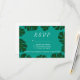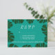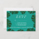 Tarjetas de respuesta de bodas de la playa de Monstera palm RSVP. Dé una respuesta a sus invitados si vienen a su elegante boda en la playa. Este diseño combina con invitaciones similares a la recepción de bodas. Personalizable de texto y calidad de papel. Tema tropical para el matrimonio de verano o destino. Se puede cambiar la paleta de color. Fondo azul turquesa.