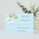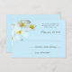Tarjetas de respuesta de invitación de boda con flores de plumeria hawaianas. Azul claro con flores blancas y texto de plantilla gris oscuro.