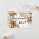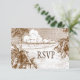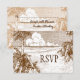 Una plantilla de tarjeta RSVP de grabado de playa tropical editable con letras de escritura y serifas en un grabado vintage de palmeras marrones en una playa de arena y hermosas nubes sobre olas tranquilas del océano, y espacio para su respuesta y fechas en el reverso.