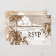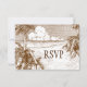 Una playa tropical editable grabando la plantilla de la tarjeta RSVP con guion y letras de serif en un grabado vintage de palmeras marrones en una playa de arena y hermosas nubes sobre olas tranquilas del océano, y espacio para tu respuesta y fechas al revés.