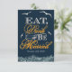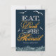 Tarjetas de confirmación de boda náuticas en azul marino y naranja: coincidir con las invitaciones y más que se encuentran a continuación en esta página. Complementa tu tema de boda náutica con estas invitaciones que presentan aves, olas en la parte inferior y la nueva frase popular, "Come, bebe y cásate". Este diseño presenta un fondo azul marino (marino) con cuatro aves blancas. La letra elegante es una combinación de colores naranja y blanco. Las olas en la parte inferior están sombreadas en un color azul muy claro. La parte posterior presenta el mismo fondo azul oscuro con un marco de ola ornamental blanco a juego para darle un toque adicional. Puedes actualizar el tipo de papel de la tarjeta a opciones más elegantes en la parte superior derecha. Cada confirmación viene con un sobre blanco ajustado. Ver la invitación de boda a continuación para obtener detalles del diseño.